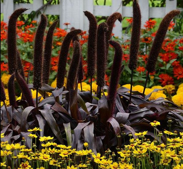 Ez a bokros növekedésű évelő díszfű mélybordó színével drámai hatást kelt a virágágyásban. Nyár végére fejlődnek ki arasznyi kalászai.